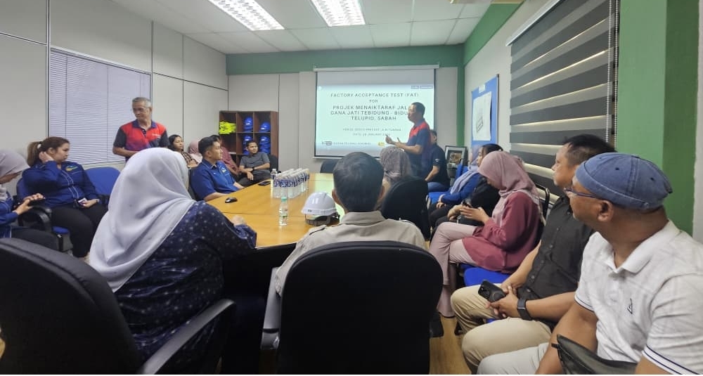 TUARAN, 28 JAN – Satu delegasi daripada Jabatan Kerja Raya (JKR) Sabah yang diketuai oleh Ketua Penolong Pengarah, Cawangan Projek Jalan Luar Bandar, Ir. Aishahturizdah binti Ashgul, telah menghadiri sesi Factory Acceptance Test (FAT) bagi Projek Menaik Taraf Jalan Gana Jati Tebidung – Bidung, Telupid. Sesi FAT tersebut telah dianjurkan oleh pihak kontraktor dan dilaksanakan di loji pembancuhan konkrit milik Sedco Precast Sdn. Bhd.