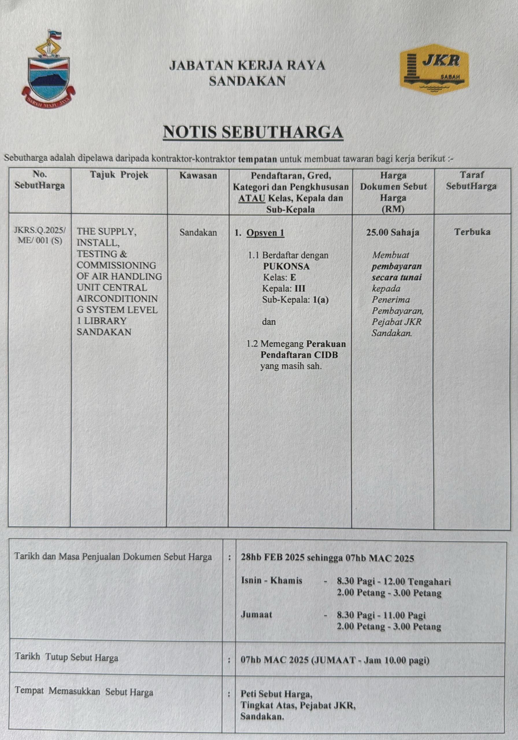 Notis Sebutharga: http://jkr.sabah.gov.my/wp-content/uploads/2023/12/130-NOTIS-SEBUTHARGA.pdf